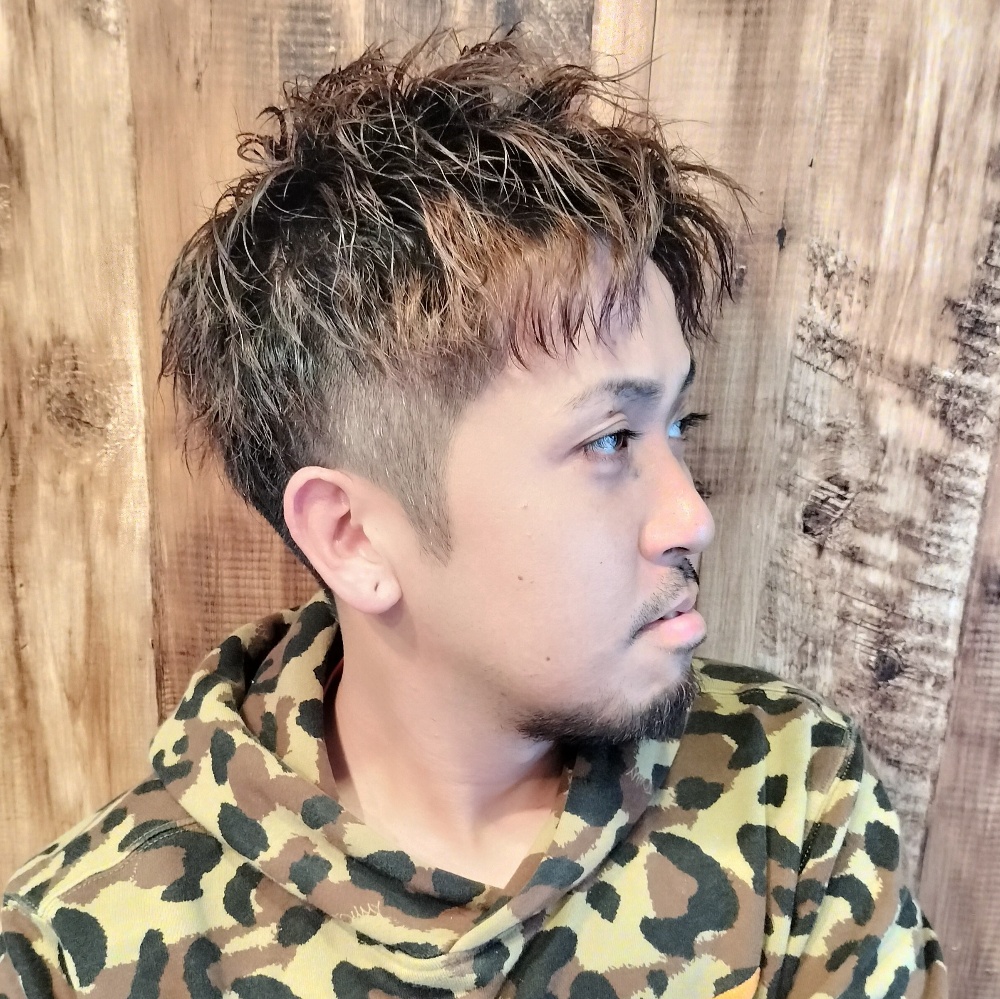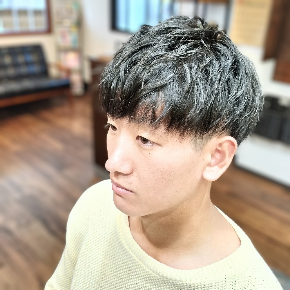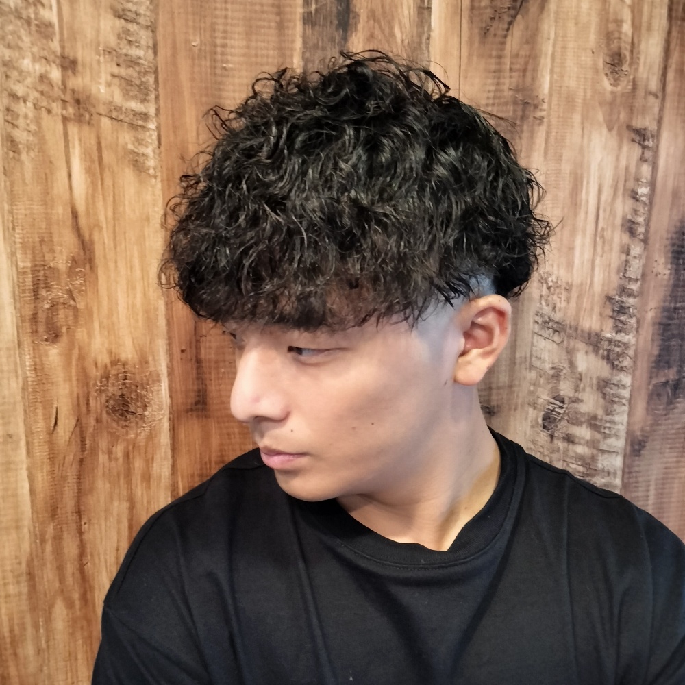ツーブロックのショートヘアスタイルにランダムに動くツイストパーマ。短いスタイルにツイストを当てる事で自然に立ち上がりセットも不要なほどにボリューム出る。アップバングでクール×カッコイイ。3mm〜6mmのグラデーションカットでよりオーバーセクションのパーマを強調。グリスやジェル、ワックスなどツヤのある整髪料を使う事でカッコよさが倍増。