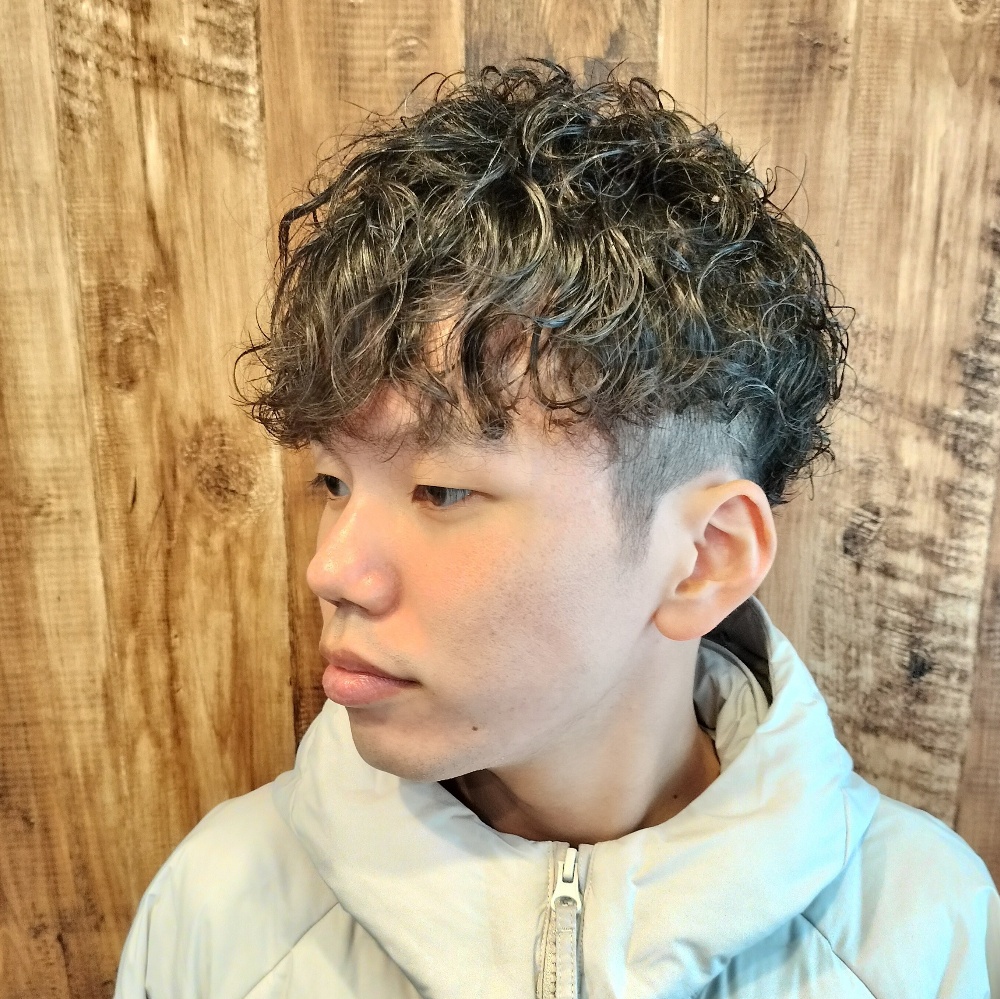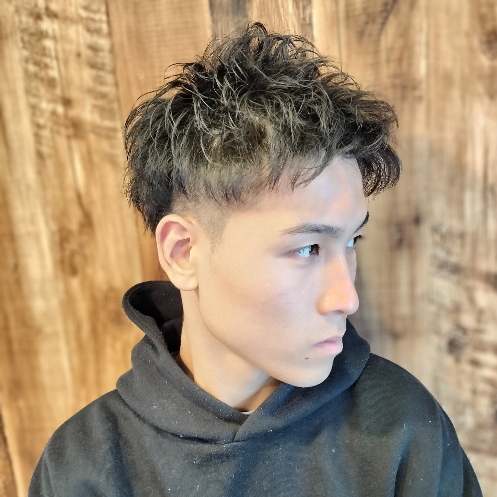 ツイスパとスキンフェードのコラボレーション。アンダーセクションはゼロmmからグラデーションのフェードカットでツーブロック。オーバーセクションは細かい動きが特徴的なツイストスパイラルパーマをフロントからトップまで全体にチオでパーマをあて、ソフトムースで動きを出した後、ワックスでさらに束感を出しました。
