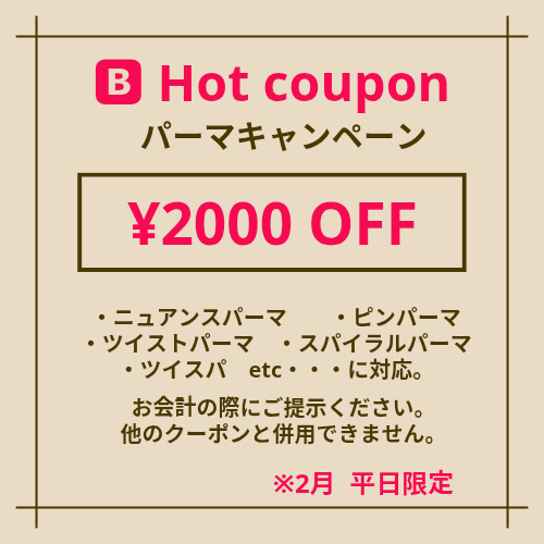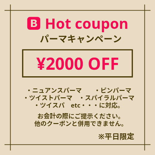 パーマはニュアンスパーマ、ツイストパーマ、スパイラルパーマなど種類、バリエーションも豊富にご用意しています。